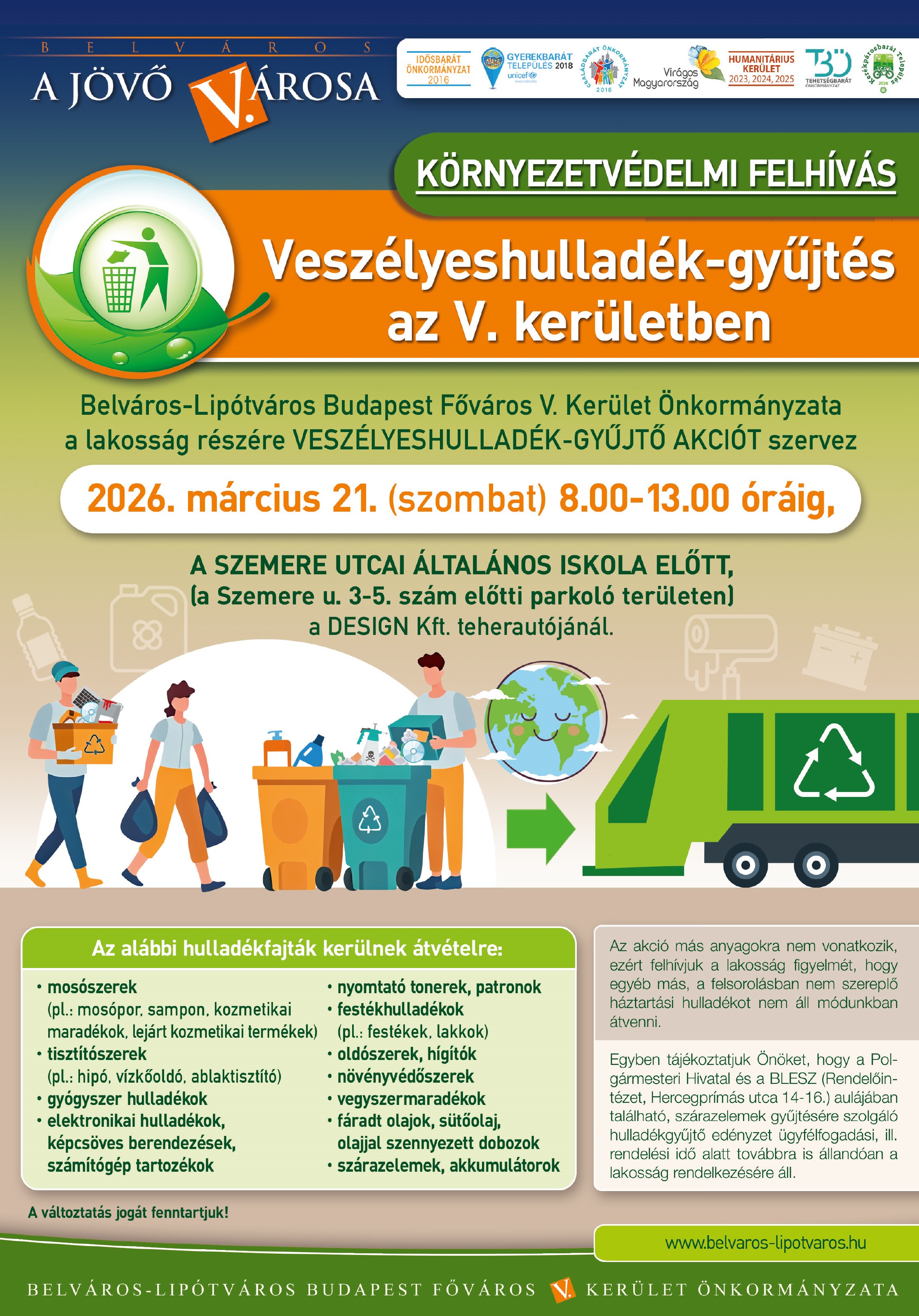 Belváros-Lipótváros Budapest Főváros V. Kerület Önkormányzata - az elmúlt évek gyakorlata alapján - a lakosság részére veszélyeshulladék-gyűjtő akciót szervez 2026. március 21. (szombat) 8:00 - 13:00-ig.